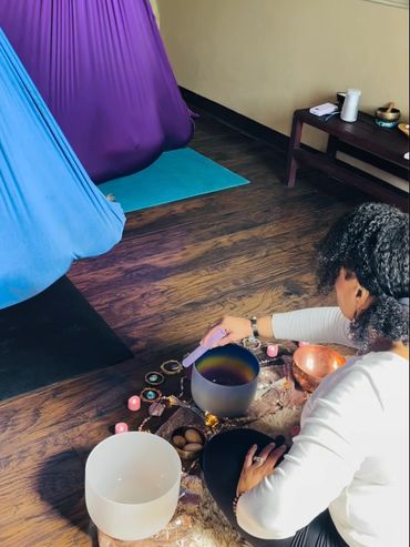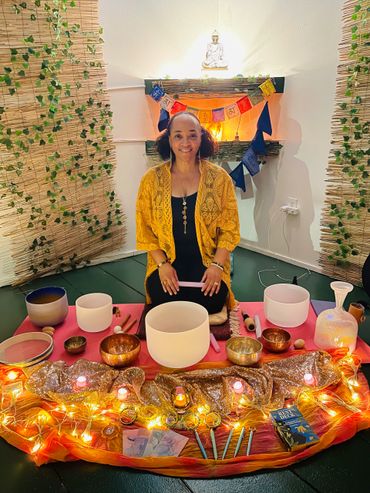 Himalayan singing bowls, Crystal bowls, chimes, drums and guided vibrations to release stress and induce relaxation.